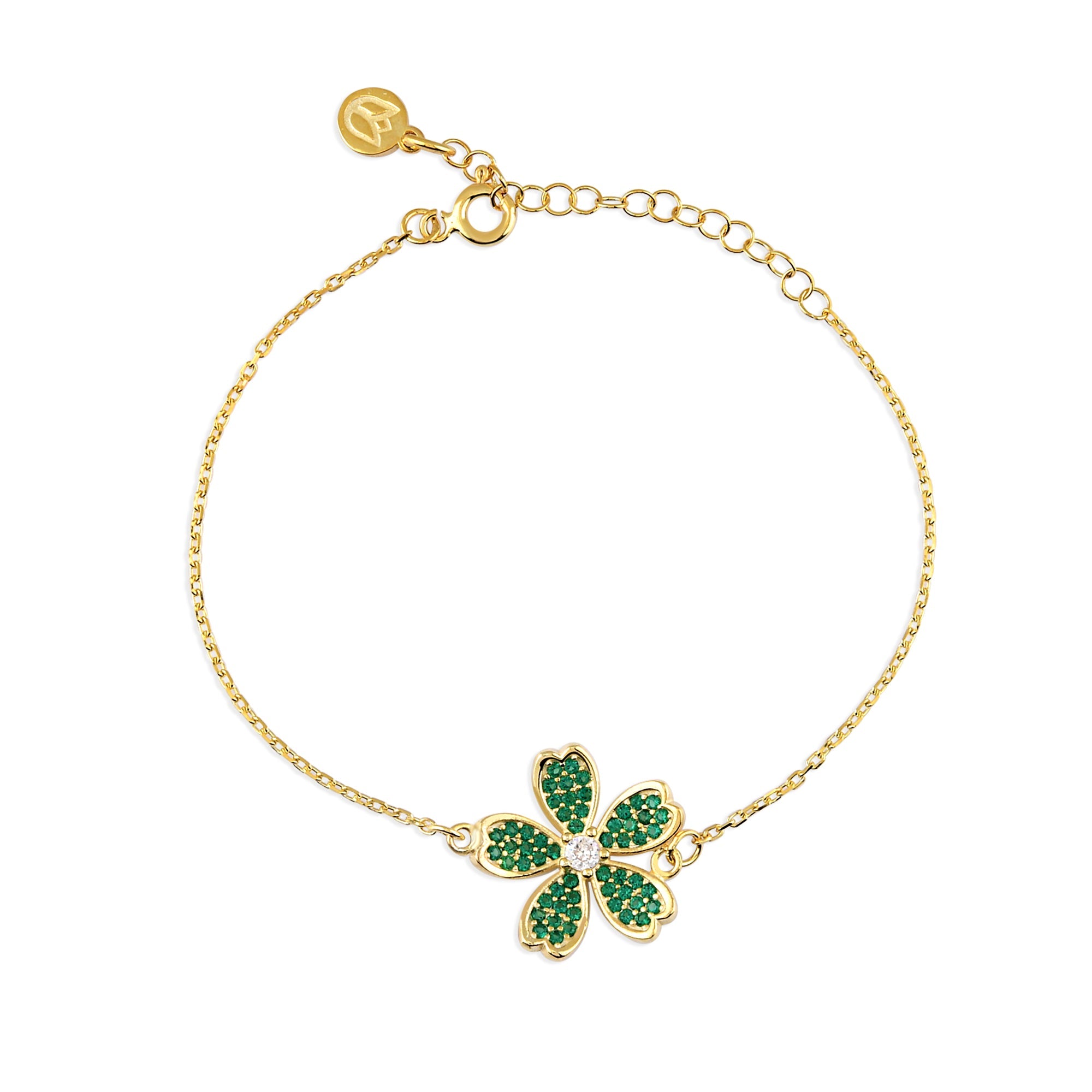 Introducing the Emerald Zirconia Daisy Bracelet, a stunning piece that combines elegance and charm. This bracelet features exquisite zirconia stones beautifully arranged in a daisy design, perfect for adding a touch of sophistication to any outfit. Crafted from high-quality 925 silver sterling and finished with a luxurious gold vermeil, it ensures durability and a radiant shine. Pair it with our matching earrings to complete your look and make a statement at any occasion. Enhance your jewelry collection with this delightful bracelet today!